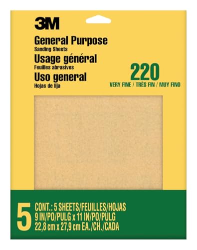 9% off 3M Sandpaper, 220 Grit, 5 Sheets, 9 in x 11 in, Sands Paint, Wood & Metal, Great For General Purpose Sanding, Very Fine Aluminum Oxide Sand Paper (9000NA-20) 9% off