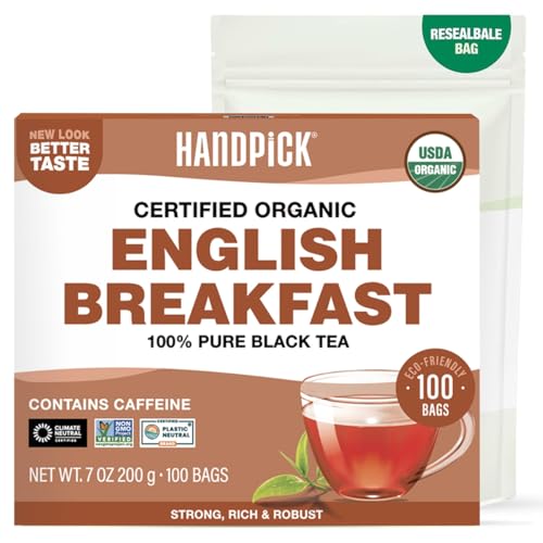 10% off HANDPICK, Organic English Breakfast Black Tea Bags (100 Count) USDA Organic, Non-GMO | Strong, Robust, High-Caffeine Black Tea | Eco-conscious Tea Bags, Brew English Breakfast Tea & Kombucha Tea 10% off